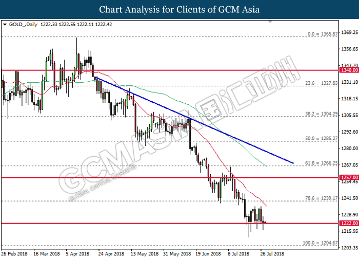 GOLD_, Daily: Harga emas telah meneruskan kerugiannya selepas ia berundur dari garisan 20-MA (merah). Kedua-dua garisan MA yang masih melebar ke bawah mencadangkan harga komoditi ini untuk meneruskan kerugiannya selepas ia memecahkan tahap sokongan yang kukuh di 1222.00.