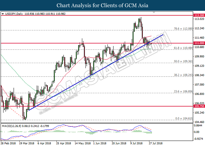 USDJPY, Daily: USDJPY telah didagang dengan lebih rendah selepas ia memecahkan garisan trend menaik. Namun, petunjuk MACD yang memaparkan penyusutan pada momentum menurun mencadangkan pasangan ini untuk melanjutkan keuntungannya pada jangka pendek selepas ia menutup di atas tahap rintangan 111.00.