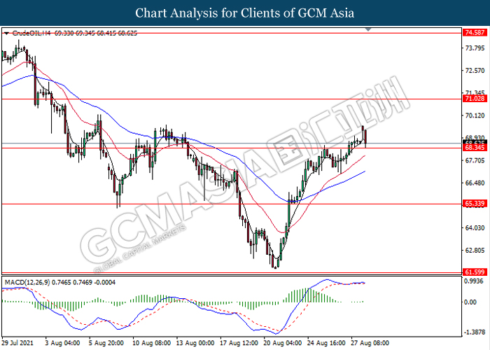 Di pasaran komoditi, harga minyak mentah meningkat sebanyak 0.02% kepada $68.69 setong semasa penulisan berikutan dengan kebimbangan yang berterusan terhadap Taufan Ida. Menurut kepada laporan, Taufan Ida sedang melalui Teluk Mexico dan memaksa penutupan dan pemindahan dalam ratusan pelantar minyak luar pesisir. Syarikat tenaga telah menghentikan lebih daripada 95% pengeluaran minyak mentah di Teluk Mexico A.S berikutan dengan ribut tersebut. Sebaliknya, harga emas meningkat sebanyak 0.05% kepada $1814.67 se troy auns pada masa penulisan berikutan dengan kelemahan dolar.