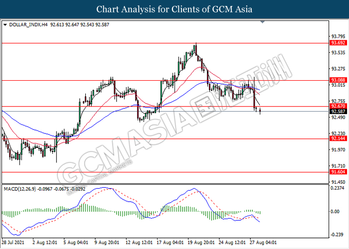 DOLLAR_INDX, H4: Indeks dolar telah didagang dengan lebih rendah susulan dengan pemecahan pada tahap sokongan sebelumnya 92.65. MACD yang memaparkan isyarat bias bearish dengan formasi silang kematian mencadangkan dolar untuk melanjutkan kerugiannya ke arah tahap sokongan 92.15.