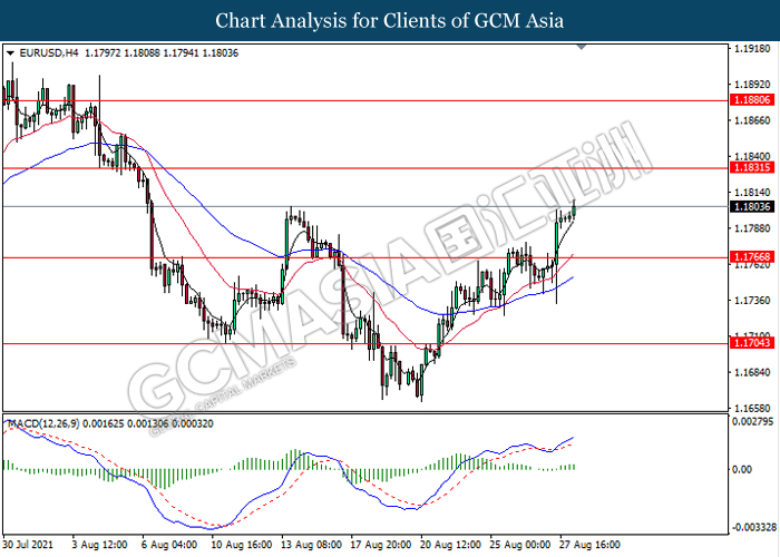 EURUSD, H4: EURUSD telah didagang dengan lebih tinggi susulan dengan pemecahan pada tahap rintangan sebelumnya 1.1765. MACD yang memaparkan isyarat momentum bullish yang berterusan mencadangkan pasangan ini untuk melanjutkan keuntungannya ke arah tahap rintangan 1.1830.