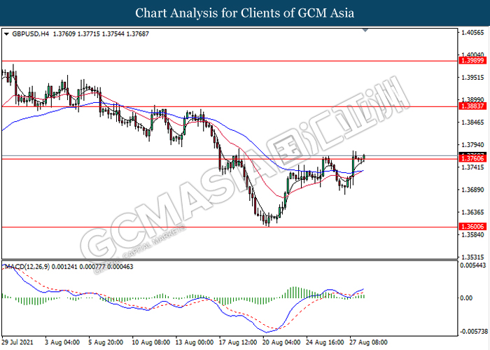 GBPUSD, H4: GBPUSD telah didagang dengan lebih tinggi susulan dengan pemecahan pada tahap rintangan sebelumnya 1.3760. MACD yang memaparkan isyarat momentum bullish mencadangkan pasangan ini untuk melanjutkan keuntungannya ke arah tahap rintangan 1.3885.