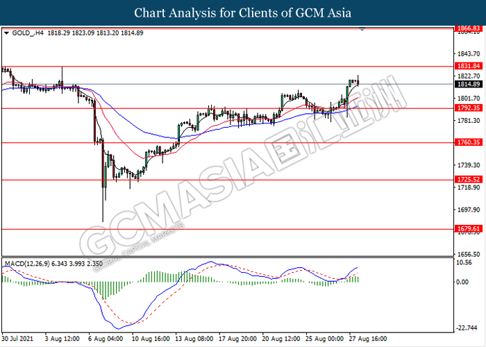 GOLD, H4: Harga emas telah didagang dengan lebih tinggi sementara ia sedang menguji berhampiran dengan tahap rintangan 1831.85. Namun, MACD yang memaparkan isyarat momentum bullish yang berkurangan mencadangkan komoditi ini untuk mengalami pembetulan teknikal ke arah tahap sokongan 1792.35.