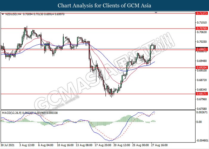 NZDUSD, H4: NZDUSD telah didagang dengan lebih rendah sementara ia sedang menguji tahap sokongan 0.6990. MACD yang memaparkan isyarat momentum bullish yang berkurangan mencadangkan pasangan ini untuk melanjutkan pengundurannya selepas ia memecah tahap sokongan tersebut.