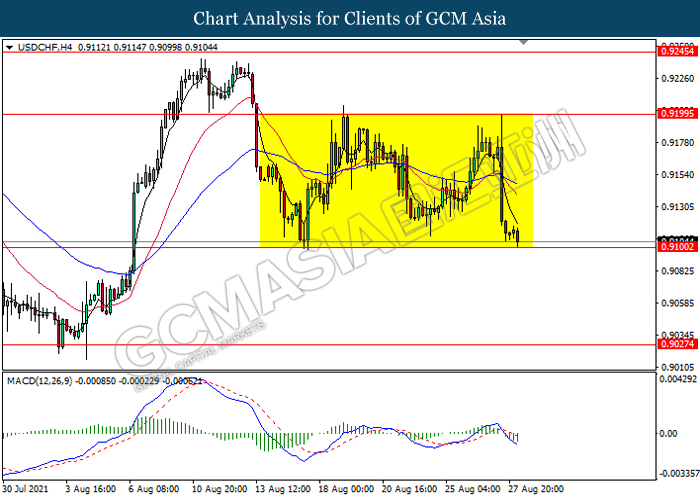 USDCHF, H4: USDCHF kekal didagang dalam saluran sisi sementara ia sedang menguji tahap sokongan 0.9100. MACD yang memaparkan isyarat momentum bearish dengan formasi silang kematian mencadangkan pasangan ini untuk melanjutkan kerugiannya selepas ia memecah tahap sokongan tersebut.