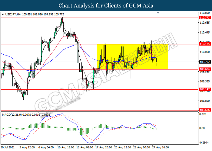 USDJPY, H4: USDJPY kekal didagang dalam saluran sisi sementara ia sedang menguji berhampiran dengan tahap sokongan 109.60. Namun, MACD yang memaparkan isyarat momentum bearish mencadangkan pasangan ini untuk didagang dengan lebih rendah selepas ia memecah tahap sokongan tersebut.