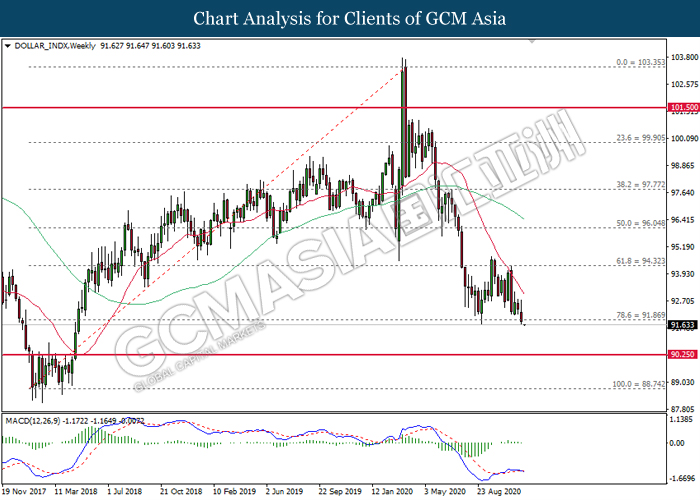 DOLLAR_INDX, Weekly: Indeks dolar telah didagang dengan lebih rendah selepas ia menutup di bawah 91.85. MACD yang mula untuk membentuk isyarat bearish mencadangkan harganya untuk meneruskan kerugian ke 90.25.