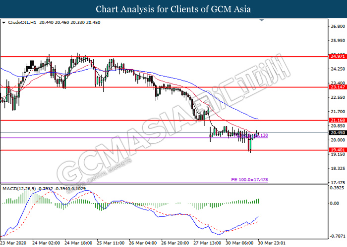 CrudeOIL, H1: Harga minyak mentah telah didagang dengan lebih tinggi selepas ia memecah tahap rintangan terdahulu di 20.15. MACD yang memaparkan isyarat momentum bullish yang berterusan mencadangkan komoditi ini untuk melanjutkan keuntungannya dan menuju ke arah tahap rintangan di 21.15.