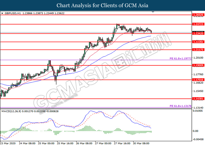 GBPUSD, H1: GBPUSD telah didagang dengan lebih rendah sementara ia sedang menguji tahap sokongan di 1.2340. MACD yang memaparkan isyarat momentum bearish yang berterusan mencadangkan pasangan ini untuk melanjutkan kerugiannya selepas ia memecah tahap sokongan tersebut.