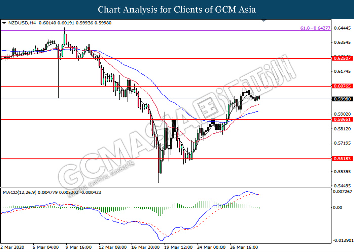 NZDUSD, H4: NZDUSD telah didagang dengan lebih rendah selepas ia berundur dari tahap rintangan di 0.6075. MACD yang memaparkan isyarat momentum bearish dengan formasi silang kematian mencadangkan pasangan ini untuk melanjutkan kerugiannya dan menuju ke arah tahap sokongan di 0.5865.