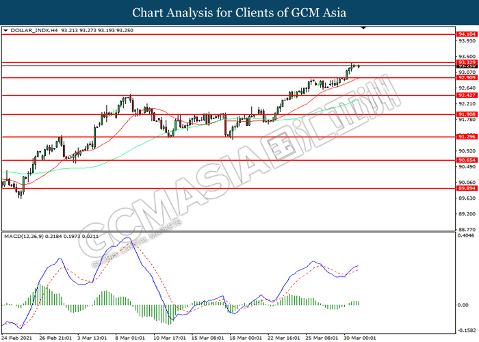 DOLLAR_INDX, H4: Indeks dolar telah didagang dengan lebih tinggi sementara kini menguji di tahap rintangan 93.35. Namun, MACD yang memaparkan momentum bullish yang berkurangan mencadangkan indeks tersebut untuk mengalami pembetulan teknikal bagi jangka pendek.