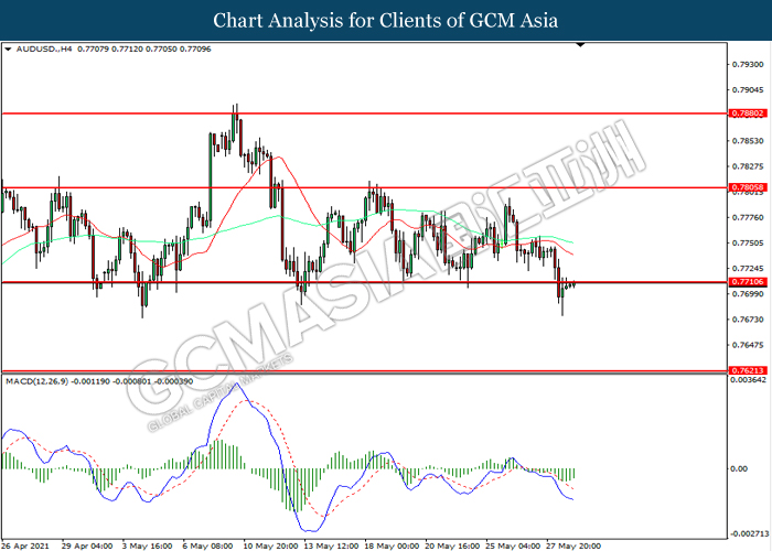 AUDUSD, H4: AUDUSD telah didagang dengan lebih rendah sementara kini menguji di tahap sokongan 0.7710. Namun, MACD yang memaparkan momentum bearish yang berkurangan mencadangkan pasangan ini untuk mengalami pembetulan teknikal bagi jangka pendek.