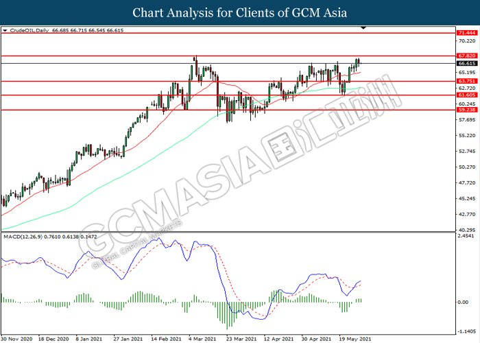 CrudeOIL, Daily: Harga minyak mentah telah didagang dengan lebih tinggi sementara kini menguji di tahap rintangan 67.80. MACD yang memaparkan momentum bullish mencadangkan komoditi ini untuk melanjutkan keuntungannya selepas ia memecah tahap rintangan tersebut.