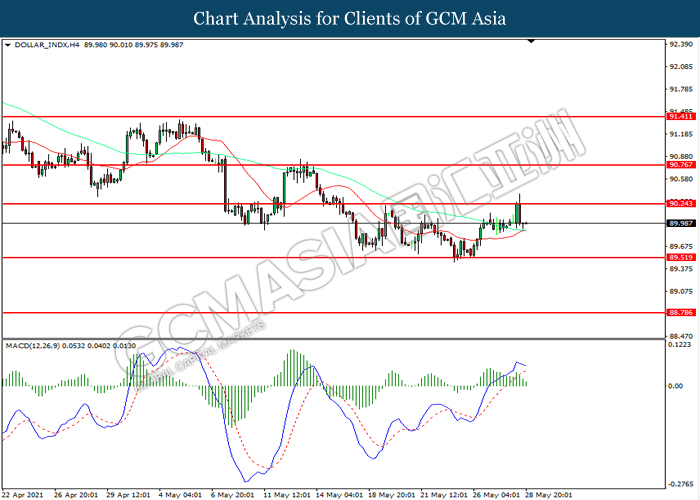 DOLLAR_INDX, H4: Indeks dolar telah didagang dengan lebih rendah selepas ia berundur dari tahap rintangan 90.25. MACD yang memaparkan momentum bullish yang berkurangan mencadangkan indeks tersebut untuk melanjutkan kerugiannya ke arah tahap sokongan 89.50.