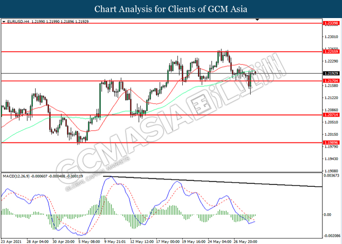 EURUSD, H4: EURUSD telah didagang dengan lebih tinggi selepas ia melantun dari tahap sokongan 1.2170. MACD yang memaparkan momentum bearish yang berkurangan mencadangkan pasangan ini untuk melanjutkan keuntungannya ke arah tahap rintangan 1.2255.