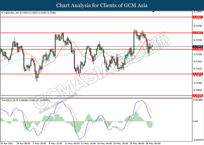 NZDUSD, H4: NZDUSD telah didagang dengan lebih rendah sementara kini menguji di tahap sokongan 0.7240. Namun, MACD yang memaparkan momentum bearish yang berkurangan mencadangkan pasangan ini untuk mengalami pembetulan teknikal bagi jangka pendek.