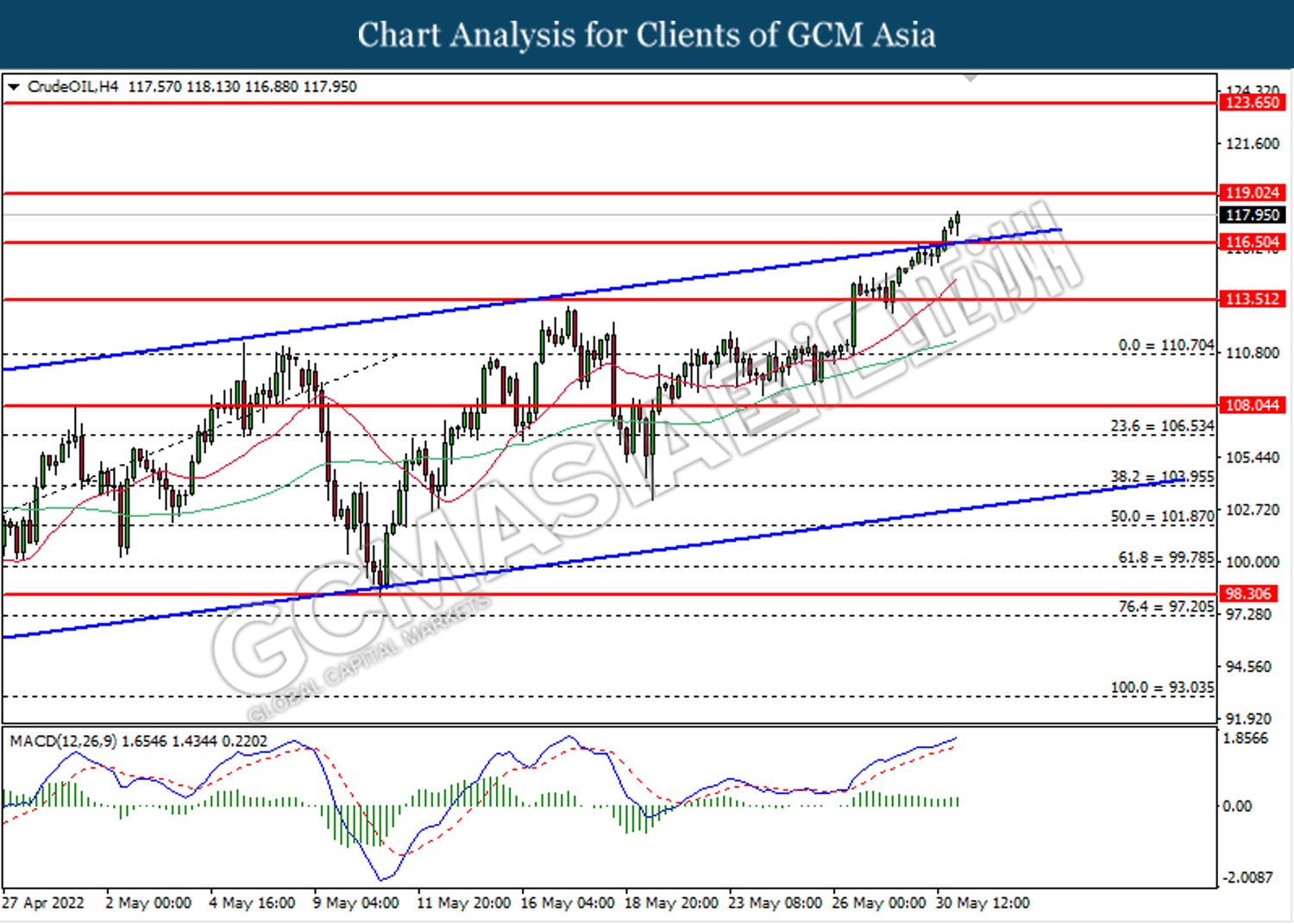 Dalam pasaran komoditi, harga minyak mentah meningkat sebanyak 0.64% ke $119.20 setong kerana EU telah mencapai kesepakatan untuk melaksanakan sekatan terhadap minyak yang diimport dari Rusia, walaupun perjanjian masih belum dimeterai. Selain itu, harga emas turun -0.29% kepada $1850.85 se troy auns di tengah-tengah pengukuhan indeks dolar.