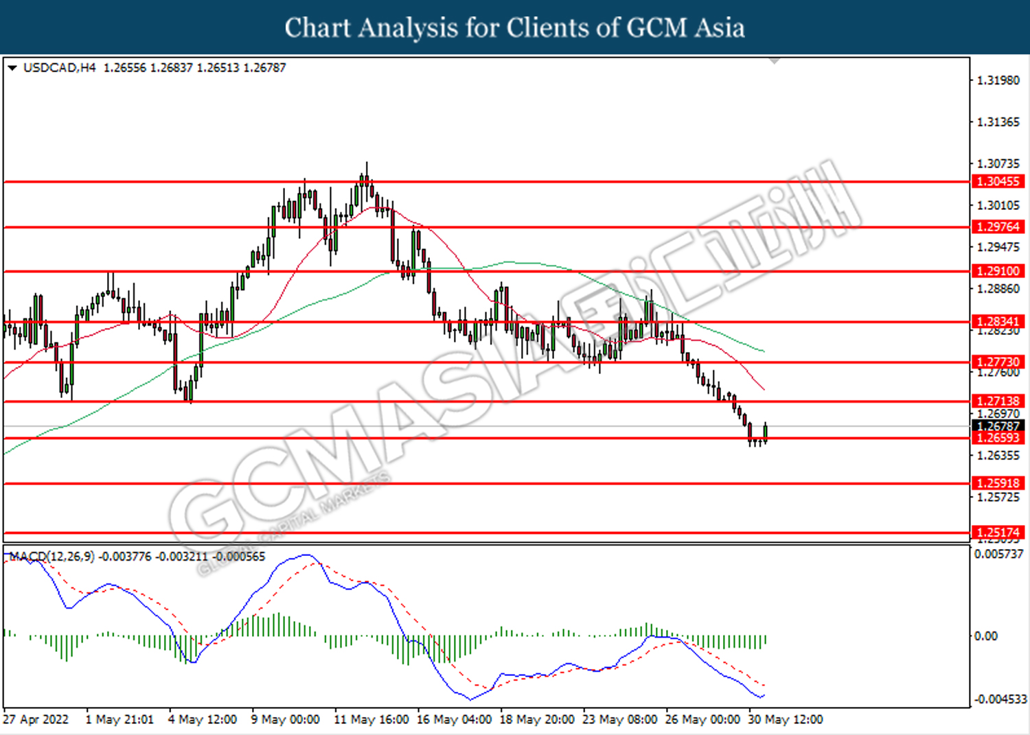 USDCAD, H4: USDCAD telah didagang dengan lebih tinggi selepas ia melantun dari tahap sokongan di 1.2660. MACD yang memaparkan momentum bearish yang berkurangan mencadangkan pasangan ini untuk melanjutkan keuntungannya dan menuju ke arah tahap rintangan di 1.2715.