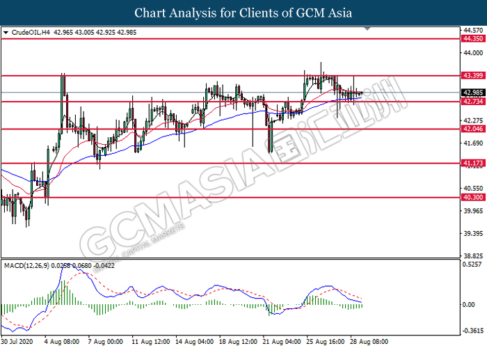 Dalam pasaran komoditi, harga minyak mentah menyusut 0.05% ke $42.95 setong kerana kebimbangan pasaran terhadap Taufan Laura telah menurun kerana ia dijangka tidak akan memberikan impak yang besar terhadap harga minyak. Pakar pasaran meramalkan bahawa pengeluaran minyak akan pulih dengan cepat kerana kekuatan taufan ini tidak sekuat seperti jangkaan sebelumnya. Di samping itu, harga emas meningkat 0.48% ke $1973.65 setroy auns kerana peralihan dasar sasaran inflasi di AS mendorong pelabur untuk melarikan diri ke aset selamat iaitu emas.