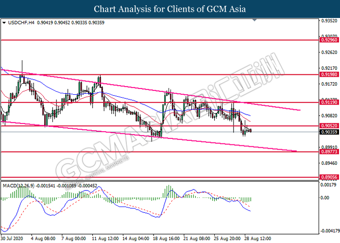 USDCHF, H4: USDCHF telah didagang dengan lebih rendah selepas ia memecah tahap sokongan sebelumnya di 0.9050. Namun, MACD yang menunjukkan isyarat momentum bearish yang berkurangan mencadangkan pasangan ini untuk didagang dengan lebih tinggi untuk jangka masa yang pendek.