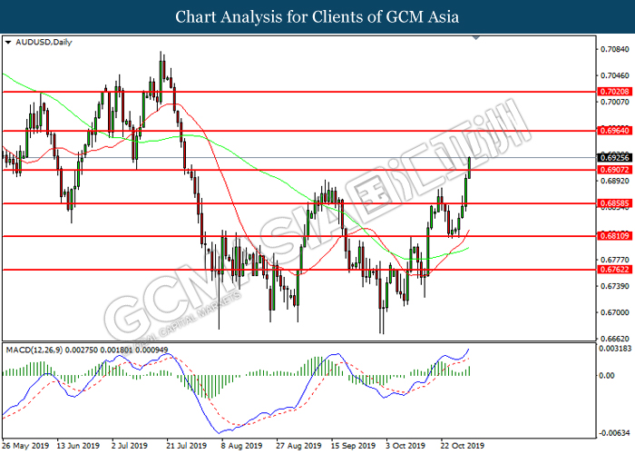 AUDUSD, Daily: AUDUSD telah didagang dengan lebih tinggi selepas ia memecah tahap rintangan terdahulu 0.6905. MACD yang memaparkan momentum bullish mencadangkan pasangan ini untuk melanjutkan keuntungannya ke arah tahap rintangan 0.6965.
