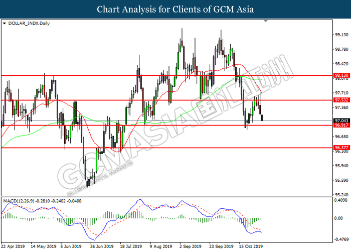 DOLLAR_INDX, Daily: Indeks dolar telah didagang dengan lebih rendah selepas ia berundur dari tahap rintangan 97.55. Namun, MACD yang memaparkan momentum bearish yang berkurangan mencadangkan indeks ini untuk mengalami pembetulan teknikal bagi jangka pendek.