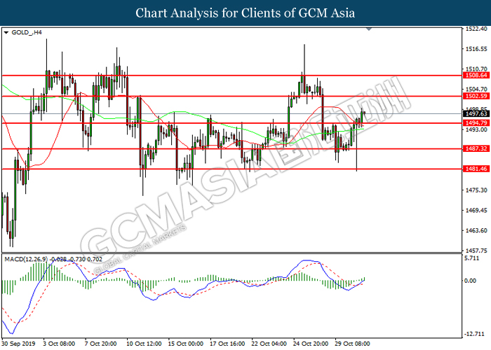 GOLD_, H4: Harga emas telah didagang dengan lebih tinggi selepas ia melantun dari garisan MA (Merah). MACD yang memaparkan momentum bullish mencadangkan komoditi ini untuk melanjutkan keuntungannya ke arah tahap rintangan 1502.60.